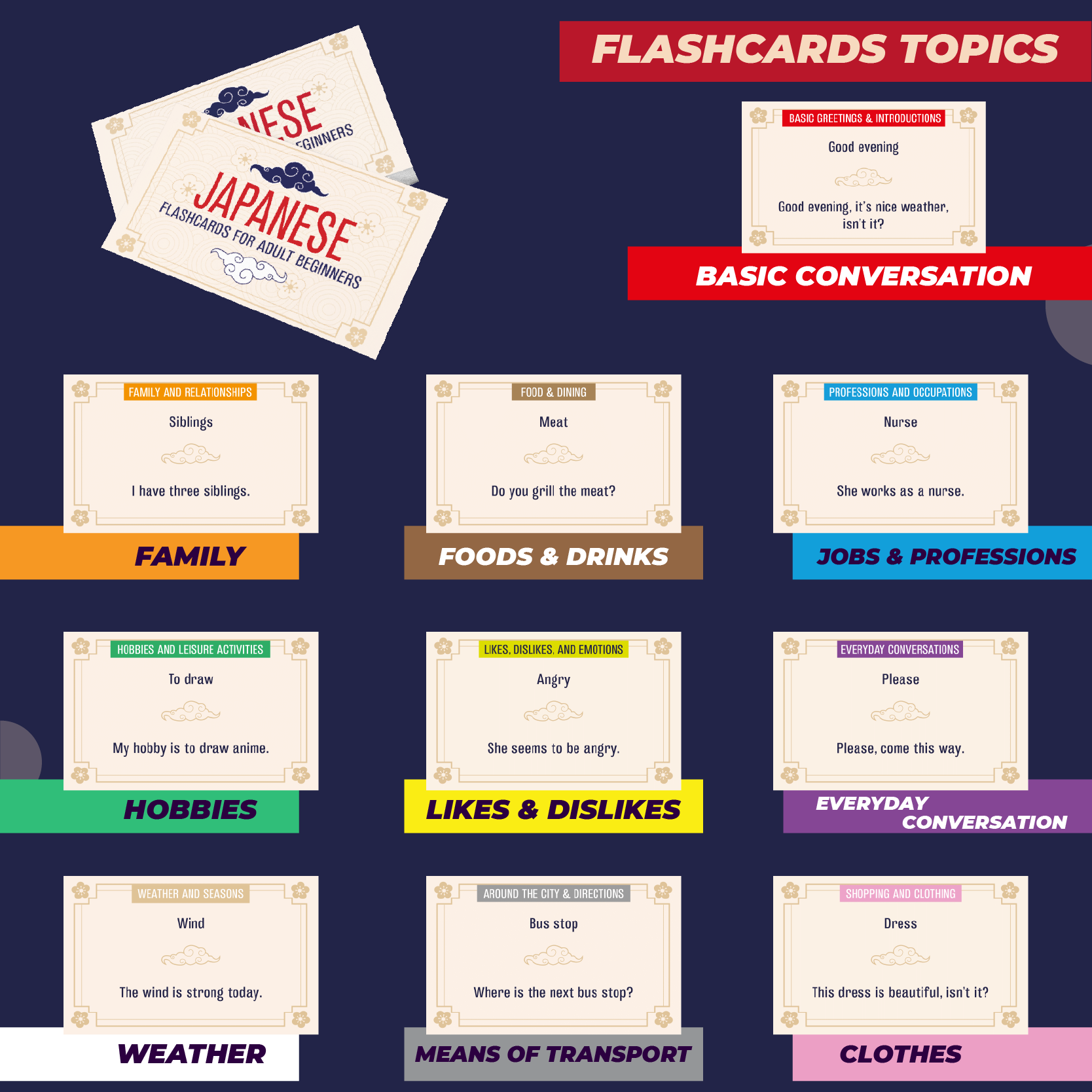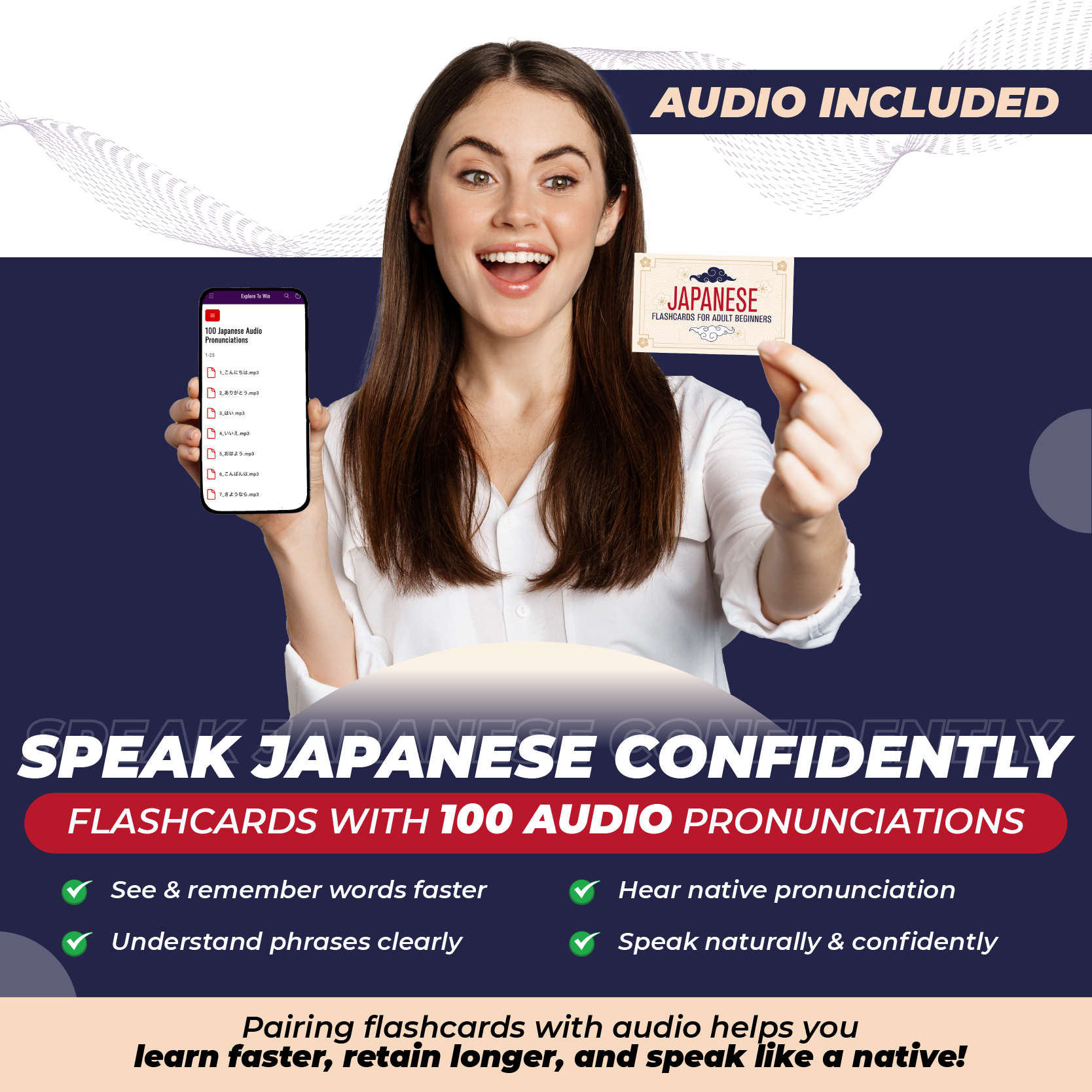 ✔ Incluye todo lo que necesitas para comenzar : recibirás 100 tarjetas físicas con palabras y frases japonesas esenciales para la conversación diaria, junto con ejemplos de uso en la vida real.